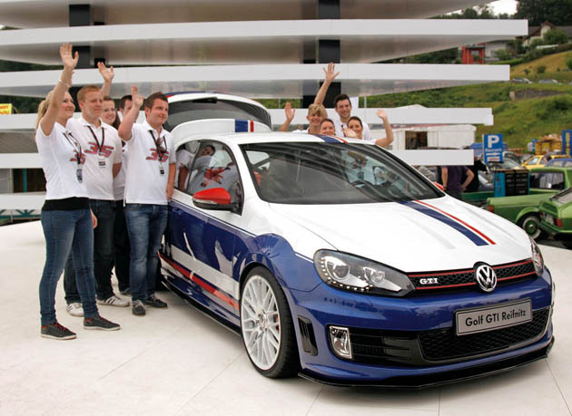 So along with their reveal of the drop top Golf R, Volkswagen have debuted the meanest GTi which was built by their own apprentices. This GTi has a stage III turbo kit and a performance exhaust fitted. What does it churn out? A thrilling 370 hp from the same engine that we know producing 210hp. The exterior has been done too. An aggressive looking body kit has been added with some mean twin hood vents and racing stripes…