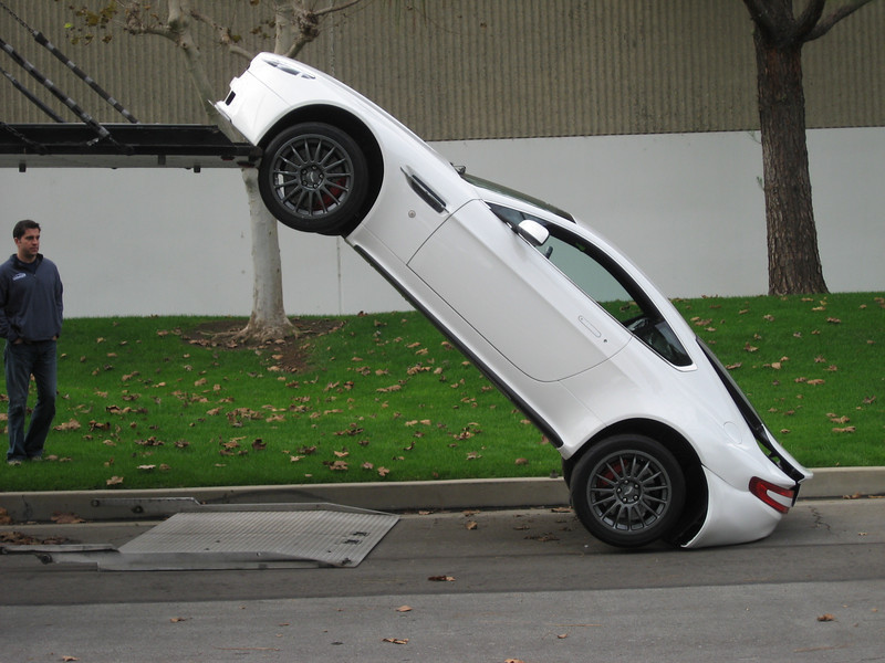 I previously did a story on the Ferrari that was unloaded by some serious idiots. Well here is another example of when the delivery guys mess-up. A beautiful Aston Martin V8 Vantage ended up at 45 degrees in front of the dealership. The rear of the car is not looking healthy at all but the front seems ok. This is an expensive mistake on a car that probably has less than 5km on the clock.