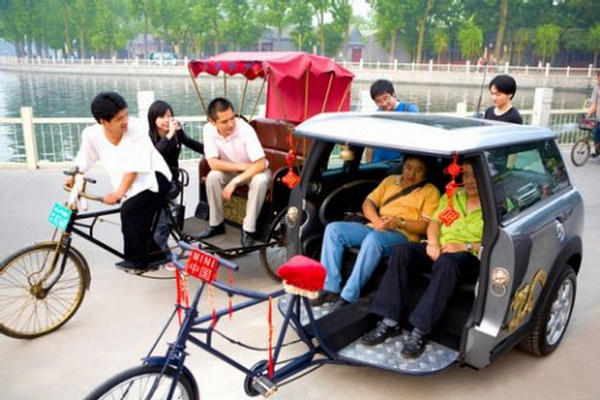 Recently spotted in China is this rickshaw taxi which is half a Mini Cooper. It looks quite neat but must be one hell of a mission to pull? At least a couple of hundred kg’s? Must admit, it looks a hell of a lot comfier than the actual rear seats of a Mini Cooper.