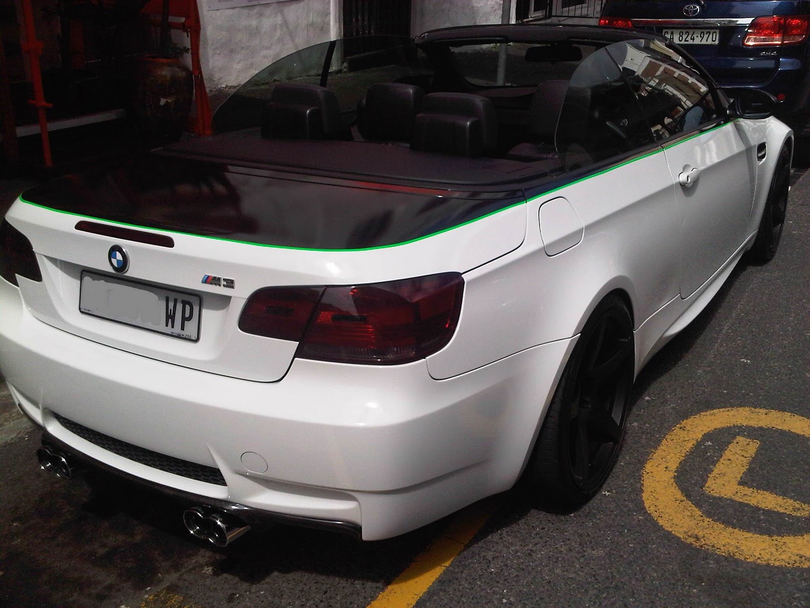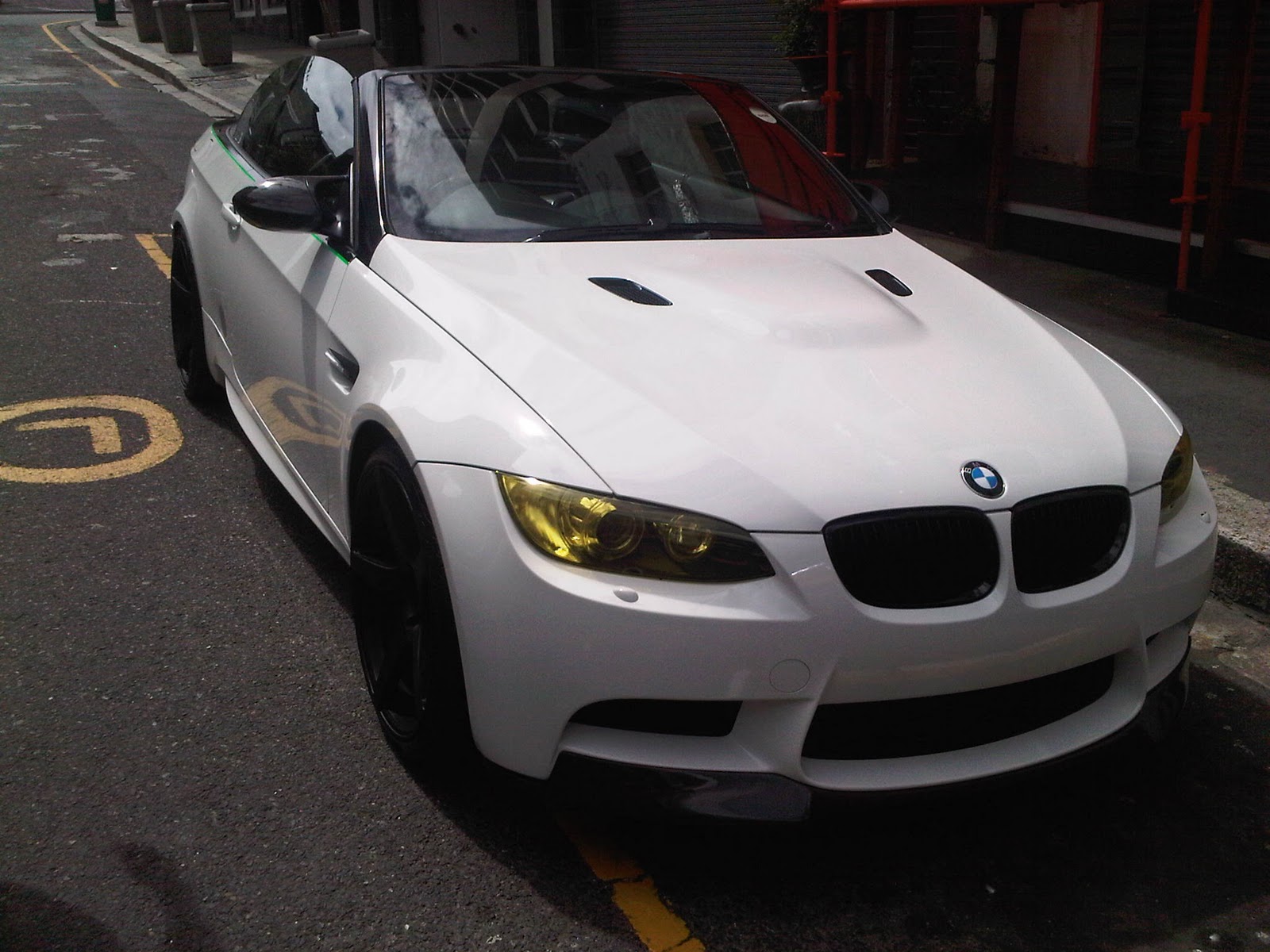 Saw this ‘tuned’ BMW M3 Convertible over the weekend and thought it deserved a post. I think the massive matte black rims looked fantastic and I think it was the AC Schnitzer exhaust system on there because it made one beautiful noise. Where it all goes wrong for me are the yellow tinted headlights and the green trim stripe along the rear of the car. The blacked out rear lights looked superb with the wheels and the black top trim but the negatives really pulled the car down for me. What do you all think?