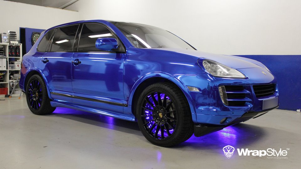 Share Facebook Email Twitter LinkedIn WhatsApp Telegram TinTek car wrapping experts have turned this Cayenne into a blue monster. If it was not chrome it would look better I feel and the LED lighting is the absolute definition of Overkill!