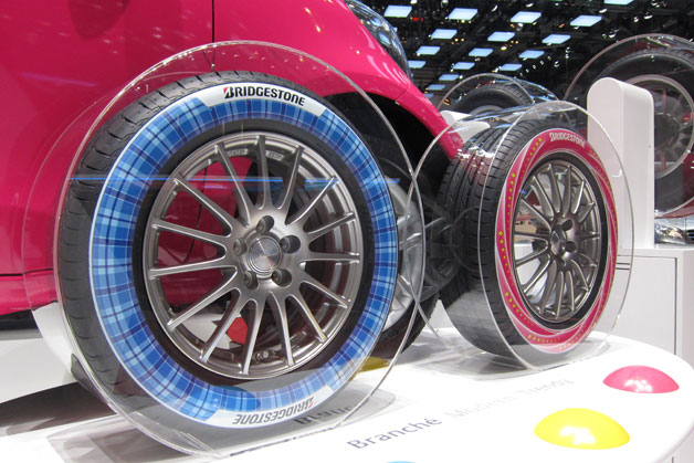 Bridgestone have come up with a way to print onto tyres. No longer do the tuners and just excessive people have to stick with black, you can choose any colour and/or pattern to print onto the tyre wall. They claim that the outer (protective) layer will not scratch and so your artwork will remain untouched even when you decide to grind your rims on the sidewalk.