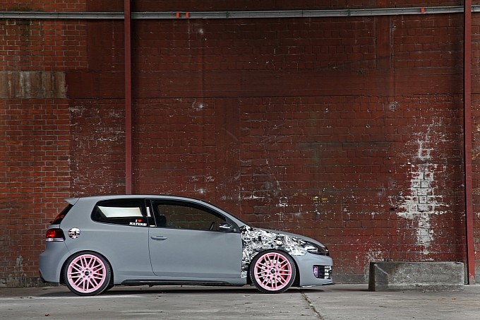 Came across pictures of the strangest GTi tuning I have seen. It has a matte gray finish for the full body and the lower grille and front wings have comic book images on them. It features the awesome Golf R exhaust system and comes complete with PINKwheels… Whoever came up with this design needs a big running f#ck slap!