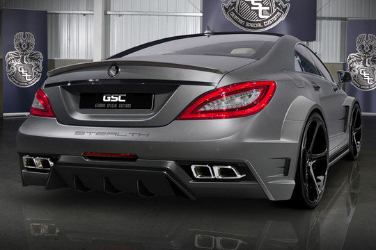 Ok ok, I cannot believe my eyes this morning. This kit for the CLS63 has completely blown the likes of Mansory and Hamann out of the water. Introducing the GSC (German Special Customs) Stealth. The kit is quite easily in the top 3 of most extreme. To be honest, it is flipping awesome! I am sure some machine guns can be installed as an extra too because this thing really does look like a Stealth fighter. The insane bodykit comprises of: front apron, vented bonnet, black grille, spoiler lip, huge wheel arches, even huger side skirts and a very sensible rear spoiler. The icing on the cake is the matte grey finish with those deep concave glossy black wheels. Nothing has been said on performance upgrades but I can tell you not many people will challenge this thing on the roads… It is proper SCARY!