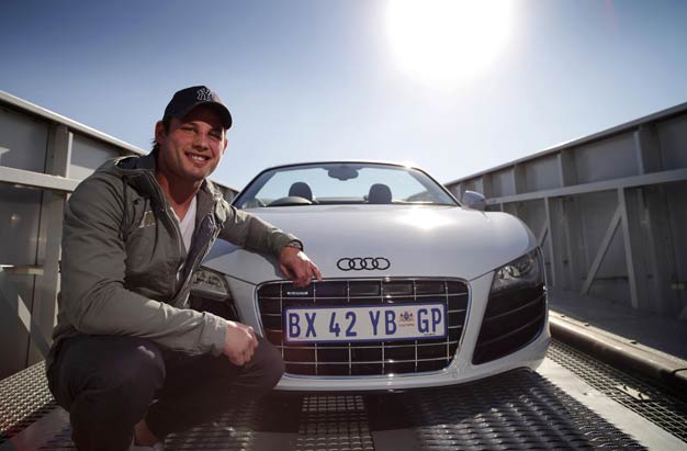 Springbok and Bulls scrumhalf, Francois Hougaard, was lucky enough to receive a brand-spanking new V10 R8 Spyder. It was sponsored by Prime HP and Audi Centre Northcliff which makes this the biggest car sponsorship of a South African sportsman. Well done Hougaard but I am seriously jealous seeing as you are a year younger than I am… Car is valued at R2.2 million which is no joke, this is one serious set of wheels…