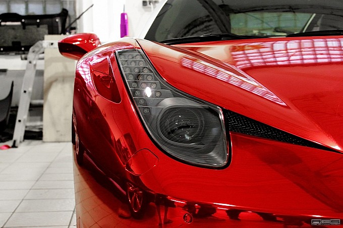 So one usually goes for a deep red on the Italia as this is the classic Ferrari colour but this particular owner decided that they needed more attention than they would already get. A Russion wrap specialist has wrapped this beauty in chrome red making the car stand out even more and with them atte silver roof completing the look, this is truly unique. I would not do this to mine (if I had one) but each to their own…