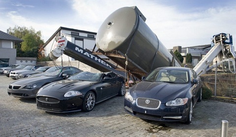 Some cars are not damaged by wreckless driving or by other idiots on the road but rather by the off chance that something falls onto it while it is innocently parked. A Jaguar XKR and BMW 6-series recently took a big hit when a crane fell onto it in a dealership parking lot. I am sure the crane company will have to fork the bill for the repair…
