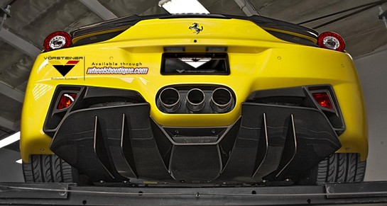 Finally we get to see the full body kit for the 458 Italia by Vorsteiner. Very sporty looking but nothing over the top. I really like how these guys get things done! A 2 piece front splitter, rear diffuser with very large fins, decklid spoiler all form part of the package and they give the Italia a really nice edge! I do not think it would stand out as much on other colours so I would stick to the yellow (if I had the choice)…