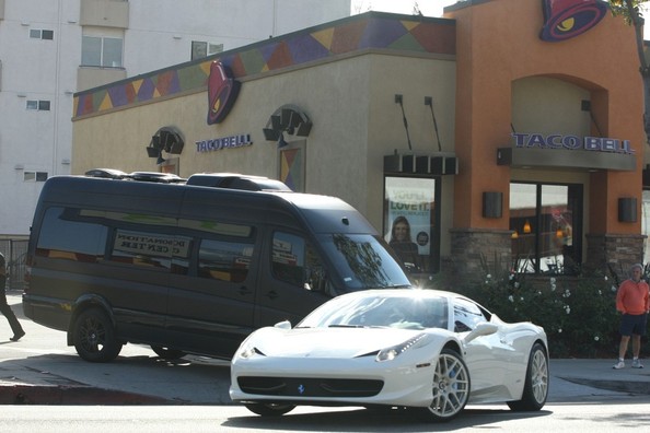 So you break up with your girlfriend and you get a 458 Italia right? Is that not normal? Bieber was seen recently in this super hot white on white Ferrari 458 Italia. It has WestCoastCustoms plates on so he may just be testing it for a while but it sure is a sweet ride and will replace the empty hole he has in his heart… Buy it dude! Check his entourage/body guards in the blacked out sprinter!
