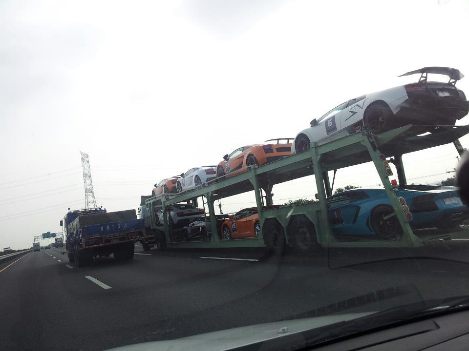 Share Facebook Email Twitter LinkedIn WhatsApp Telegram What a sight but I hate seeing such beautiful machinery being exposed to the elements when being transported! This is one serious collection! Can you imagine the insurance??? The Aventador at the back and SV at the top are the stand out Bulls!
