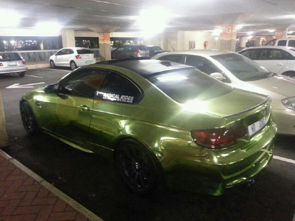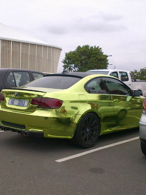 This thing was spotted by Keegan Daniel and another fellow petrolhead today. I refer to it as as thing as the owner has taken one of my favourite cars of all time the BMW M3 and wrapped it in greeny gold chrome. I do not think it is a good match for the car at all but each to their own I guess…
