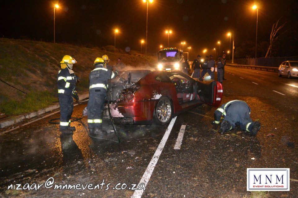 There was a serious accident last night in Cape Town which involved a Ferrari 612 Scaglietti. Sources say that the car was travelling towards town on the N2 when the driver lost control of the car, crashed through the Armco barrier, hit a pole and then landed in the outgoing lane of ‘Hospital Bend’ (notoriously bad bend on the highway in Cape Town). The car caught alight after the crash and the driver was taken to hospital with injuries that were unknown. A witness who drove past the accident scene said “they had just pulled the driver out and were struggling to pull out the passenger and by that time the car was already burning”. This is the second accident in Cape Town this year involving a Ferrari. The other was a Ferrari 458 Italia but not as serious as this one. I believe the driver is in good condition in hospital but no info on the passenger (and even if there was one). Click read more for full gallery…