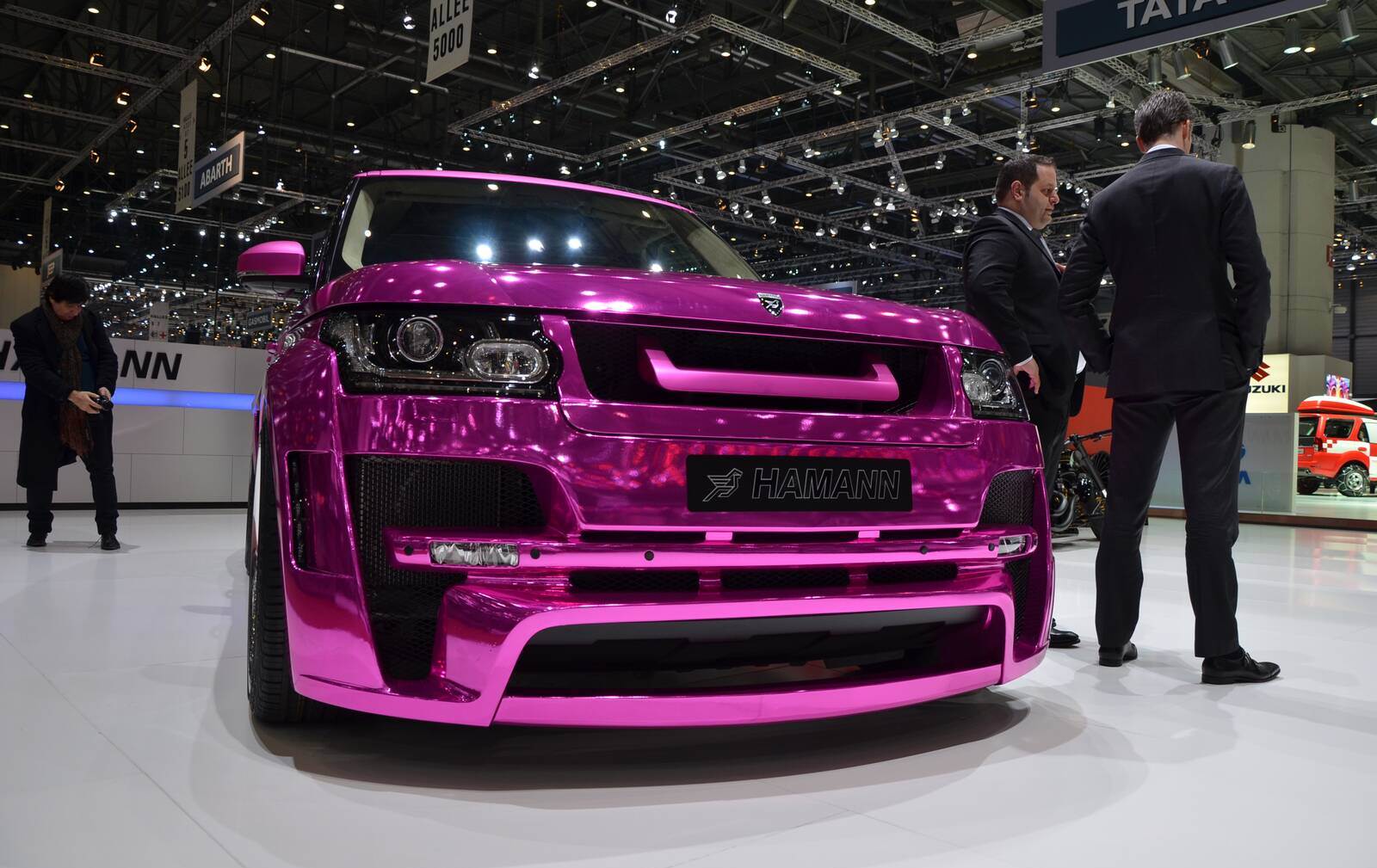 The Hamann Mystere is on display at the Geneva Motor show and it is most definitely a love or a hate car. It is based on the latest Range Rover but features a full wide bodykit, front spoiler and side sills and is now a hefty 80mm wider than standard. The chrome pink covers most of the body but there are matte pieces on the upper parts of the car. What you think of this in-your-face Rangey?