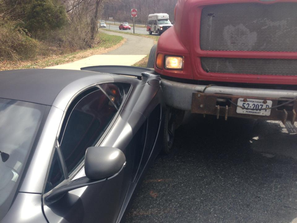 This matte black McLaren had just finished its new matte black paint job when a truck decided to drive straight into the rear left fender. I would absolutely lose my cool! Some decent damage done to the rear of the car. Reports suggest that the owner then went to a Ferrari dealership a few hours later and bought himself a Ferrari 458 Italia to use as a replacement! Money is endless for some…