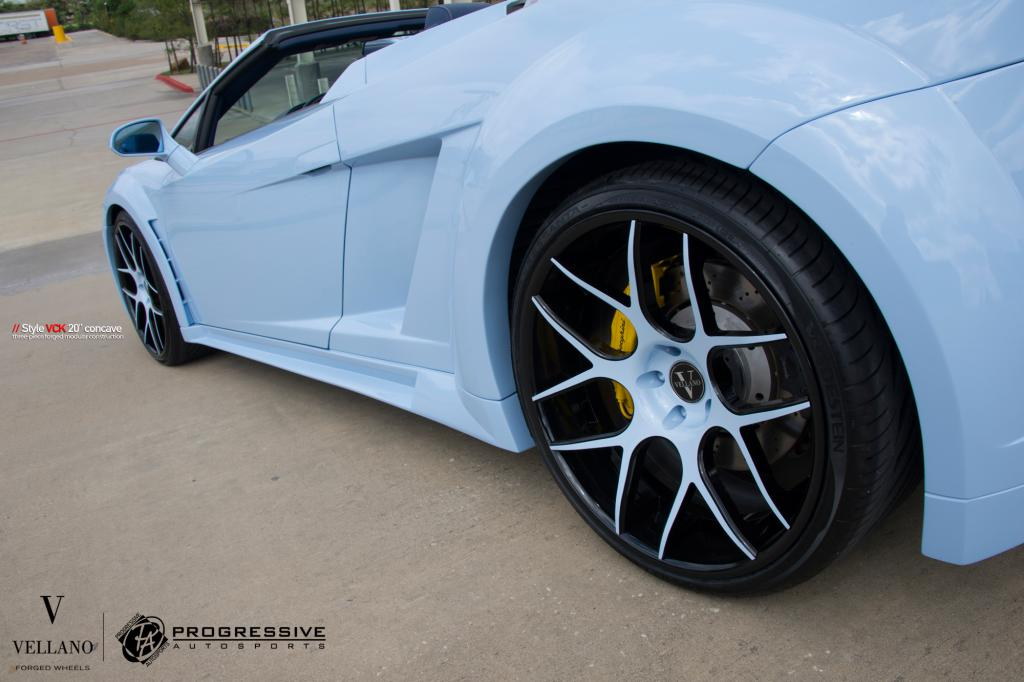 Progressive Autosports and Vellano Wheels have created a rather unique looking Gallardo Spyder. It is sporting a not so masculine baby blue which is matched by the wheels. The wheels are the most important part of this car as they are 20″ Vellano VCK Concave wheels and they really fill up the flared fenders nicely! The bodykit is quite something and not to be ignored… The car looks awesome but the colour choice not so awesome (for a man that is). A hot girl in this car would be mind-blowing!