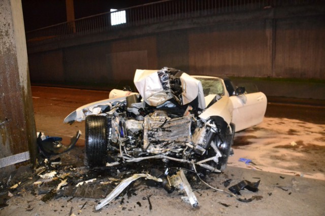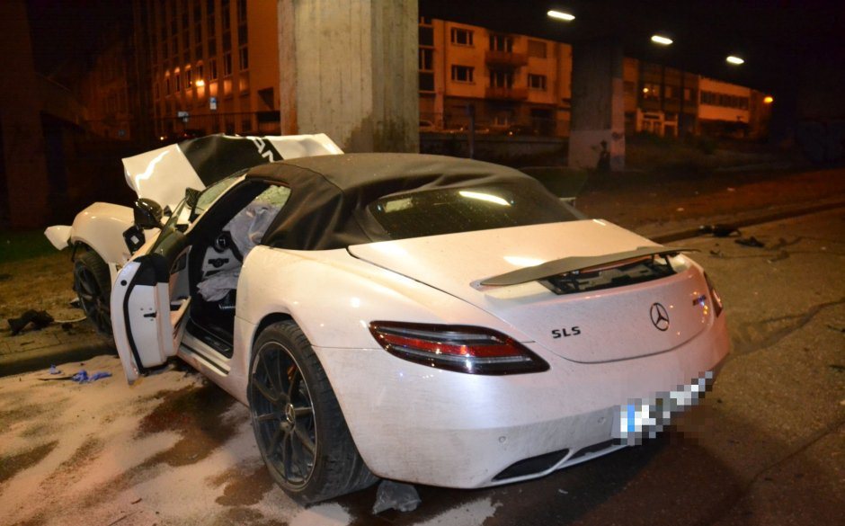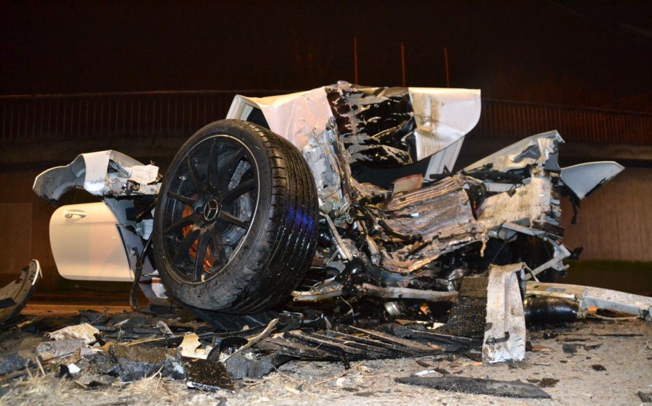 This is a heavy accident and the driver and passenger are apparently fighting for their lives after the Mercedes-Benz SLS AMG Roadster they were travelling in slammed into a bridge footing in Mannheim, Germany. The pictures show utter destruction and you can see parts of the car strewn all over the show. No details as to how the accident occurred but it seems that the car was going at a fair rate of speed. Front end completely demolished so I am sure car will be written off! This particular SLS AMG Roadster had F1 stickers on the side an AMG bonnet stripe and a black rear spoiler which made the car unique.
