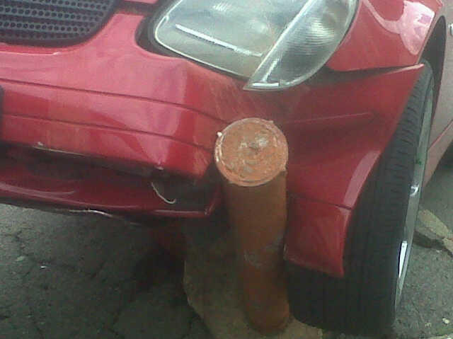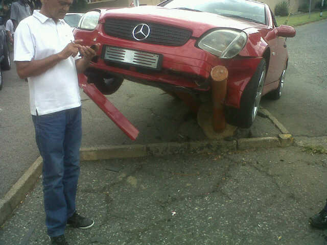 Hahaha this is actually quite a funny sight to see. It seems a 2003 Mercedes-Benz SLK has managed to get stuck on top of some concrete pillars. The accident occurred in Linmeyer (Johannesburg) where the car was speeding then lost control and smashed into the pillars and got lodged on top. No injuries to the driver just some decent damage to his baby Merc…