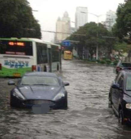 Heavy rains in the city of Shenzhen on Wednesday meant that this owner of an Aston Martin Rapide was going to take his car for quite the test. The car has water right up to its wheel arches but seems to be coping fine. I am sure it got through this alive but I only found the one picture… This reminds of the time all those supercars got stuck underground in a flood.