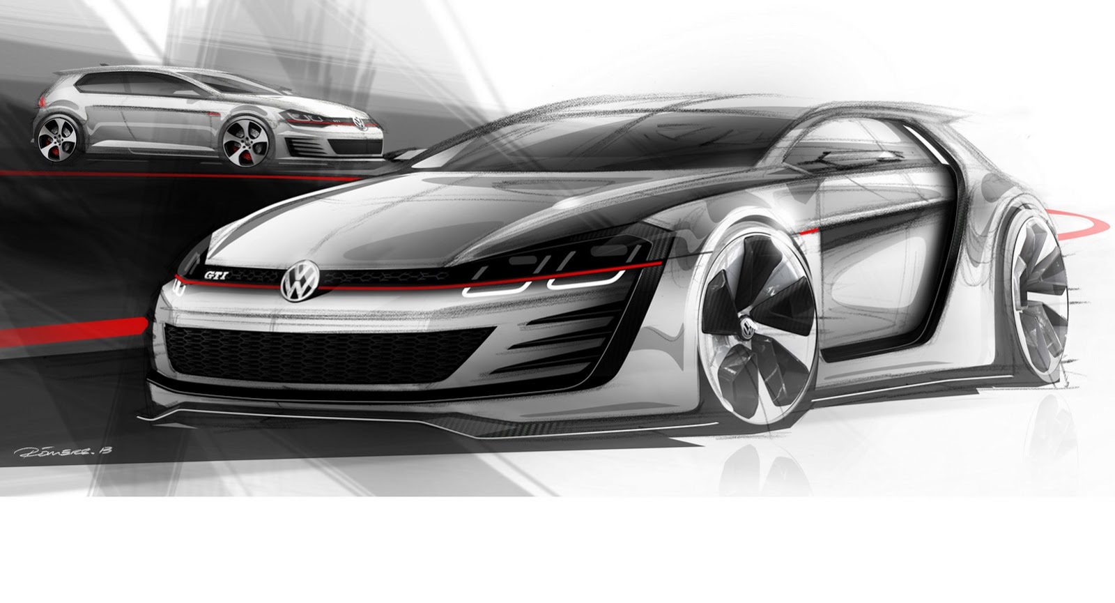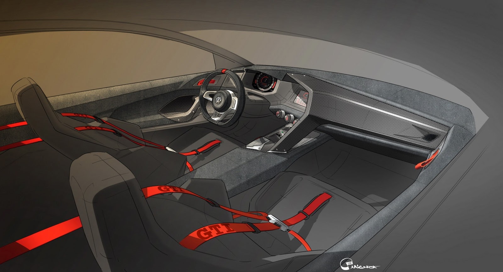 I just previously mentioned that Volkswagen would be bringing a special edition to Wörthersee and I also mentioned that it would not be as bonkers as the GTI W12 we saw in 2007. What we are now expecting is the new Design Vision GTI racing study which was created by a team under the head of design, Klaus Bischoff. So what is so great about that? Well for starters, it will be fitted with a 3.0-litre twin-turbo V6 that pushes out an almighty 496hp and 560Nm of torque. This concept will also be fitted with all-wheel drive (that power needs to be shared among the wheels) and connected to a dual-cluth DSG transmission. VW have already come out and said that it will top out at 300km/h and hit 100km/h in just 3.9 seconds. Getting the car to stop will be no problem wither because she will be fitted with ceramic brakes all round. Cosmetically, they will be adding a wide bodykit (71mm wider) to allow some big 20″ wheels and lowering it by a massive 57mm in comparison to the standard GTI. It will also feature newly styled bumpers, race-spec diffuser and lots more vents. Looking at these sketches it seems the entire interior has been completely revamped which shows new dashboard and console. I cannot wait to see this thing because if it looks anything like these sketches I might have a crisis! WOW!