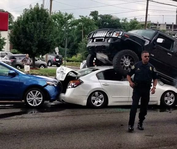 Two cars collided which resulted in a car behind that swerving to avoid collision. What they didn’t realise was as they swerved, they did so into the path of a Hummer which subsequently had to swerve and ended up like this. A lady was trapped in the white car but she was pulled out thanks to bystanders and she suffered from a broken arm (could have been a lot worse). Two others suffered minor injuries so I feel it its OK to look on the light side of this…