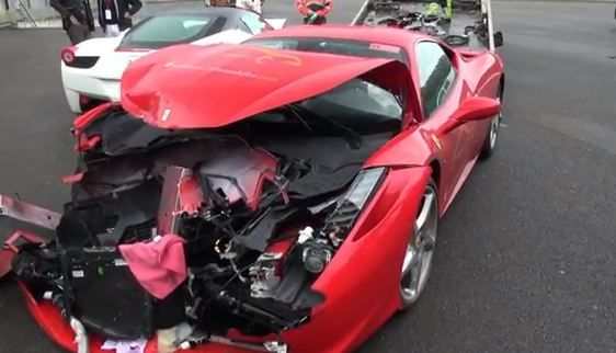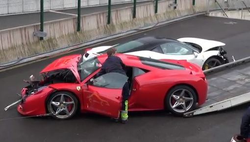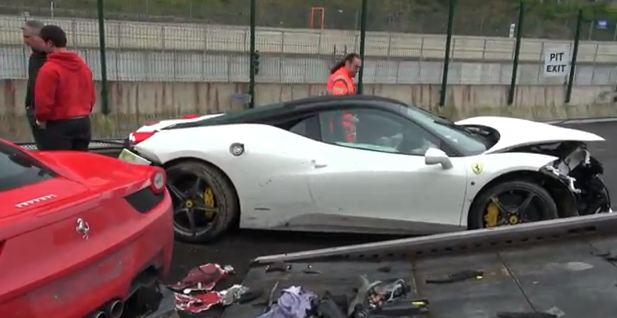 It seems the bad weather at Spa Francorchamps track was a bit too much to handle for these 2 Ferrari 458 Italia drivers. I am not sure of the exact story but it seems they both lost control in the wet and hit each other or the walls. Both look substantially damaged and they can expect a hefty repair bill unless they get a written-off note. Sad to see beautiful cars like this smashed up on a racetrack. If you know more of the story, please let me know.