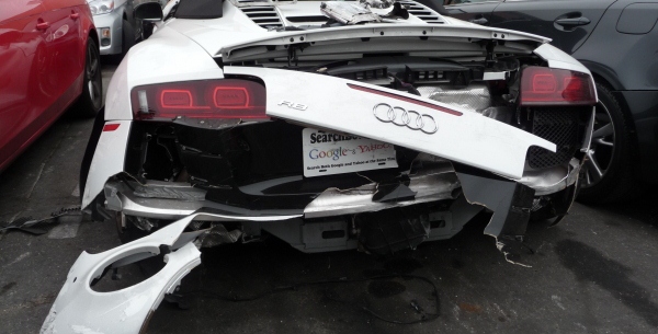 A stunning Audi R8 V10 Spyder was wrecked badly in Los Angeles recently after colliding with a lamp post. Witnesses say the driver was playing the fool when he lost control, ramped up the curb and hit a lamp pole head on! Pretty sure this will be totaled as there seems to be enough damage. Hate seeing this beautiful V10 beauty looking like this! Driver walked away unharmed…
