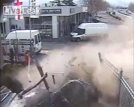 This is rather intense! A BMW 5-Series loses control at one hell of speed and slams into a car dealserhip in Georgia. CCTV managed to capture the car losing control, missing transit van by a ball hair and then slamming into the dealership fence. No word on what happened to the occupant(s) but at that rate, injury of some form is rather likely.