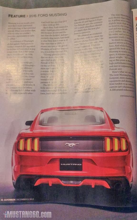 I knew this was going to happen but here we have the new 2015 Ford Mustang leaked in the upcoming issure of AutoWeek magazine. The renders were extremely accurate so we do not have any big suprises here. The front splitter, aerodynamic side skirts and bulging hood look great. Engines are expected to include a 2.3-litre EcoBoost four-cylinder with around 300 hp, a 3.7-litre V6 with around 305 hp and the big 5.0-litre V8 that will push around 420 hp. What you all think of the brand new Ford Mustang?