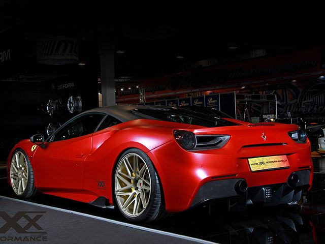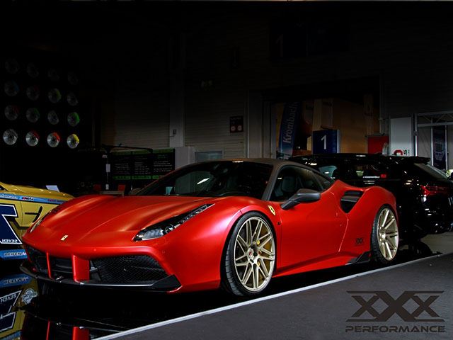 With the new Ferrari 488 GTB being turbocharged, this makes big room for tuners to really dig in and produce something special. Well it seems that xXx Performance have already done that and whipped up a more than 1000 horsepower Ferrari 488. xXx-Performance has given the supercar a different look but the largest changes have taken place out of sight as it received a 3-stage upgrade for the 3.9-liter twin-turbo V8. Stage 1 increases power to 740 hp, while Stage 2 is a little more potent at 838 hp but the real performance upgrade is the Stage 3 kit that increases output to an unbelievable 986 hp. For those of you who know their numbers, that is more powerful than a LaFerrari. To give the 488 a more aggressive look, the tuning company fitted the supercar with a matte red wrap and matte black finish on the side mirrors, front splitter, roof and side skirt flics. Gold wheels and xXx-Performance stickers round out the modifications.