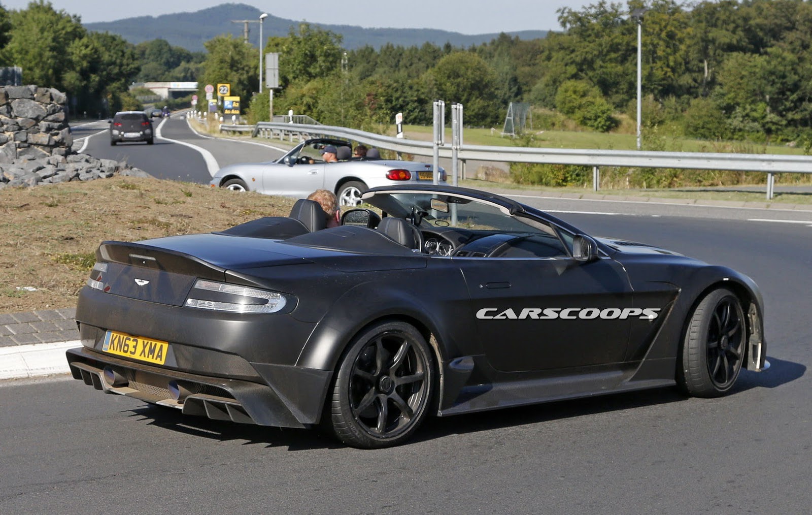 Most high-end automakers launch a hardcore Coupe and follow it up with a drop-top version but Aston Martin did not do that with the GT12. Instead the Q personalization division created a one-off for a wealthy client which we saw at Goodwood this year. Well if you have a look at the shots below (via CarScoops) you will notice that Aston Martin are busy testing a GT12 Roadster Prototype around the Nurburgring which suggests that they have decided to put it into production. If that is the case, then we can’t be too far away from seeing a production ready drop-top GT12 with a screaming 6.0-litre V12 under the bonnet. If I was the owner of the only GT12 Roadster in the world I would be properly pi**ed off but maybe Aston Martin had an agreement in place beforehand?