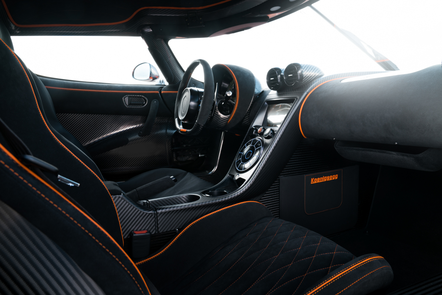 The Agera XS is presented in Karosserie Orange – an intense orange finish with diamond-dust metallic effect – and a clear carbon centre strip. The interior features black alcantara with orange contrast stitching to match the exterior. The Agera XS also comes with bespoke aerodynamics, including the largest rear wing ever fitted to a Koenigsegg, specifically designed to the owner’s wishes.