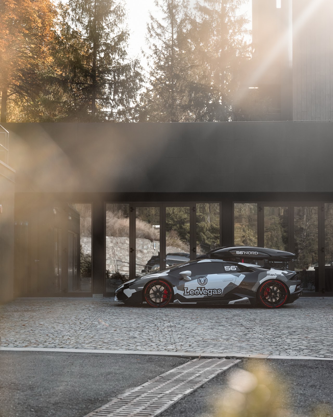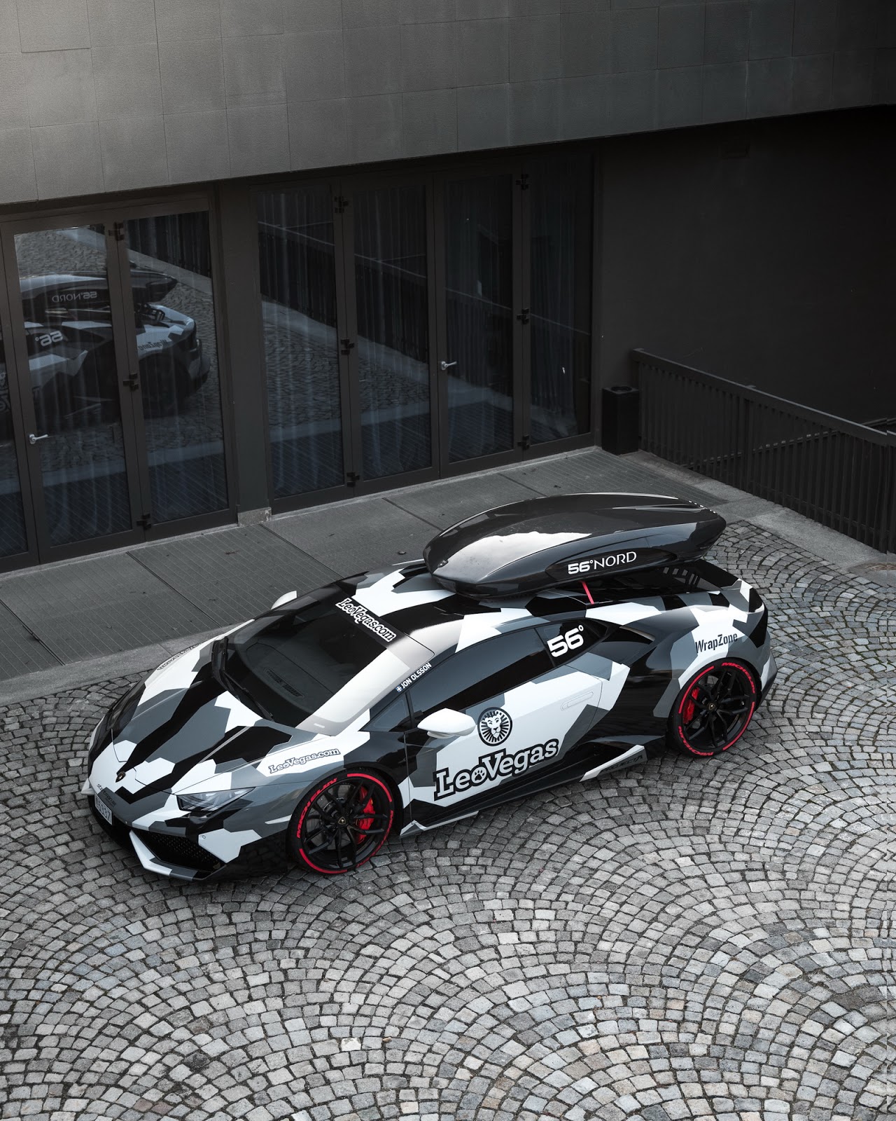 We all know Jon Olsson is one serious petrol head and his creations are always something special just like his latest addition in the form of a custom Lambo Huracan. Wrapped up in a camo that matches his villa in Marbella, Spain, the Italian supercar features a widebody kit with updated bumpers, swollen fenders and larger side skirts, along with an aftermarket wheel set and a roof-mounted ski box, for which he turned to 56Nord, according to his blog. The standard 5.2-litre V10 has been upgraded to pump out 800 horsepower thanks to a supercharger kit from VF Engineering. Not much else is known about the car but what is known is the 100 to 200 km/h sprint time of 5.3 seconds which is just 0.3 seconds slower than a Veyron.