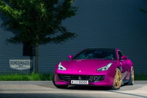 This GTC4Lusso has not only received a bright Magenta wrap but also some purple LED ‘running lights’ inside the grille. Perhaps the only saving grace are some unique gold wheels by Vossen which gives us an excellent view of the yellow brake calipers and huge rotors.