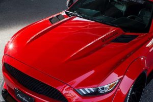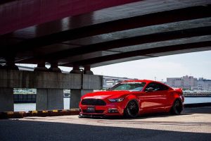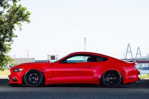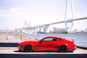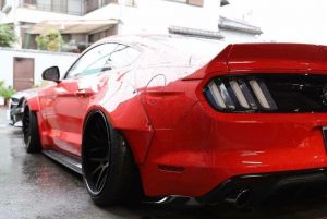A while back we got a teaser of a red Ford Mustang undergoing some Liberty Walk nip and tuck treatment and now we have shots of the completed muscle car.