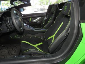 The paint colour is contrasted by a plethora of carbon fibre elements, some with a gloss finish and others with a matte finish. The original owner had great taste to trim the interior with a matching green stitching, piping and accents throughout the cabin.