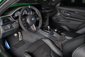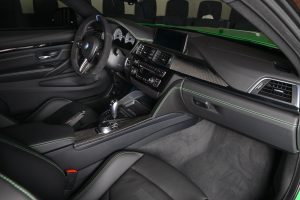 Inside you get a load of carbon fibre extra’s but the stand out is the matching green stitching and the Alcantara M Performance steering wheel.
