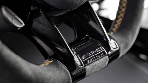 Inside you benefit from AMG’s seats lined in Nappa leather. Here, the designers went with a combination of Magma Gray and Black tones accented with yellow contrast stitching. They also added matte carbon fibre dash accents and microfibre with more yellow contrast stitching on the steering wheel.
