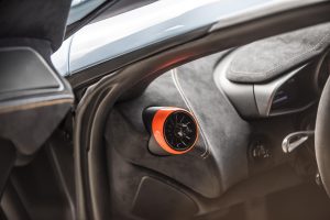 Inside the 675LT you will find MSO Bespoke racing seats finished in Carbon Black Alcantara which feature orange and blue contrast stitching. The seatbelts are orange MSO Defined while the owner’s initials are again found on the headrest embroidered in blue.