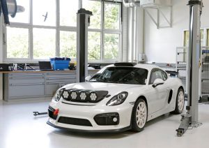 It is called the Cayman GT4 Clubsport Rallye concept and as you can see it is based on the Cayman GT4 Clubsport and features an assortment of rally specific upgrades. They [Porsche] did not go into any specifics on the project but the car has auxiliary lighting units and a roof-mounted scoop. We can also see additional underbody paneling, a roll cage and lightweight wheels wrapped in all-terrain tyres.