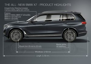 The BMW X7 will arrive in March 2019 with a range of variants including two petrol and two diesel derivatives, namely the xDrive40i and xDrive50i featuring a 3.0-litre turbocharged straight-six engine with 335 hp (250 kW) and 446 Nm of torque as well as a 4.4-litre twin-turbo V8 with 456 hp (340 kW) respectively. Diesel-powered variants meanwhile feature an xDrive30d with 261 hp (195 kW) and 620 Nm from a 3.0-litre six-cylinder engine while the star diesel wears an M50d badge producing 394 hp (294 kW) and 560 Nm of torque.