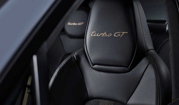 Inside, there’s seating for four, including a pair of chairs in the back. The ones in front are eight-way adjustable. All of them have center sections in perforated Alcantara with contrasting stitching in Neodyme or Artic Grey. There’s “Turbo GT” embroidery on each headrest. A yellow strip is at the 12 o’clock position on the steering wheel.