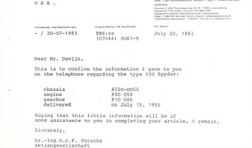 This four-speed manual transaxle was separated from the wreckage at an unknown point following his deadly accident in September 1955. The transaxle was reportedly stored for several decades prior to acquisition from Massachusetts by its current owner in 2020. This 550 Spyder transaxle is offered by the seller on behalf of its current owner in New York with a copy of a letter from Porsche verifying its origin and a documentation file.