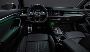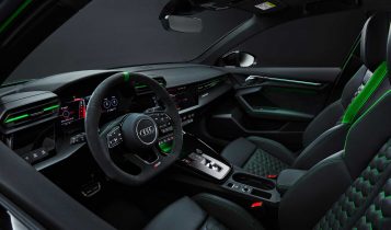 Inside you will find a Lamborghini-like interior with a 12.3-inch Audi Virtual Cockpit gauge cluster and 10.1-inch infotainment display running MIB3 as standard. You can opt for some RS-signature honeycomb seat quilting with either green, red or black stitching and if you add the interior design pack, you get even more red or green accents scattered around the interior.