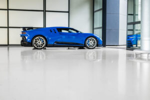 The classic combination of Bugatti Bleu and EB110 Silver for the Centodieci’s wheels is no coincidence; the owner of this first unit also owns an EB110 finished in the same iconic colours.