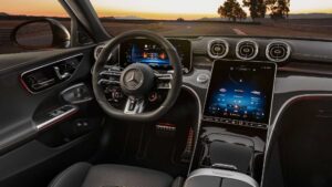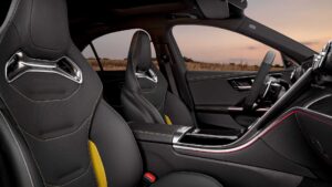 The same applies to the interior where you will find the usual AMG-specific refinements to the infotainment system, including a track pace timer and a steering wheel–mounted drive selector with dedicated buttons for the exhaust and suspension. A variety of drive modes allow the person behind the wheel to tailor the suspension, throttle and brake response, steering, and propulsion noise to their tastes. Presets include Electric, Comfort, Sport, Sport+, Race, Battery Hold, and Slippery.