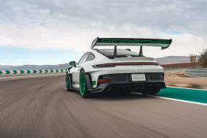 Inside you’ll find Python Green stitching and illuminated doorsill guards that read, “Tribute to Carrera RS.” The package also includes custom license plate frames, a Porsche Design watch, and a pair of 1:43 scale models, one of the 2023 GT3 RS and one of the Carrera RS.