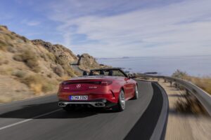 Like the Coupé, the CLE 53 Cabriolet boasts a wider track compared to the standard CLE Cabriolet, hinting at its performance aspirations. While the convertible roof sacrifices some of the coupe’s sleekness, it offers ample space for comfortable four-seater accommodation. The fabric roof operates in just 20 seconds at speeds up to 60 km/h (37 mph) and comes in a choice of red, black, or grey.