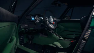 The interior prioritizes lightweight, with no radios or central infotainment screens in sight. An analogue tachometer takes centre stage in the gauge cluster, flanked by two small screens likely displaying information from Bluetooth-connected devices.