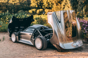The GT One’s sleek lines are sculpted from lightweight carbon fibre, designed by California-based Florian Flatau, known for his collaborations with Singer Vehicle Design. Like on the 911 GT1, the entire rear end lifts up clamshell-style – and unlike on the GT1, so does the front end.