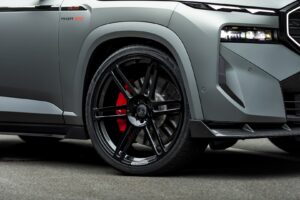 For a more aggressive stance, Manhart lowered the MHXM 900 with H&R springs. This allows the enormous Concave One wheels to fill the arches perfectly. These gloss black double-spoke rims come in a rather larhe 10×24 inches at the front and a mind-blowing 12×24 inches at the rear. Manhart also offers custom colour options for those who want a truly unique look.